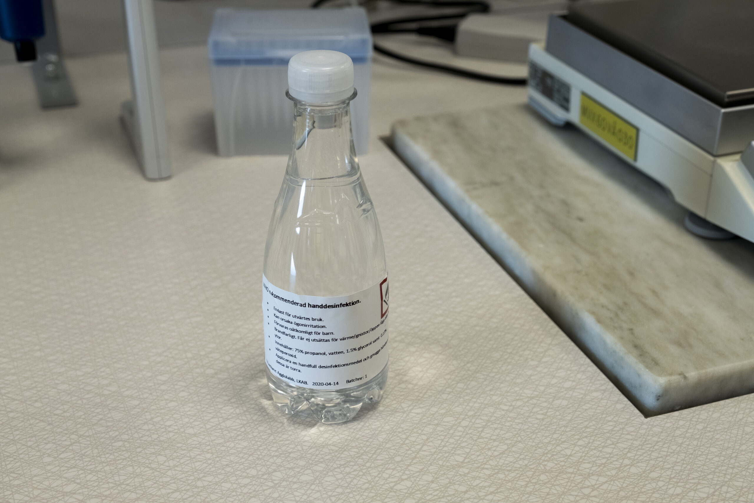 Sedan dess har det jobbats hårt för att lösa allt det praktiska: få tag i det material som behövs och se till att lagar och regler som gäller för tillverkning och distribution av handdesinfektion efterföljs.– Själva tillverkningen är enkel, det är tre reagenser som ska mixas bara. Utmaningen har varit att lösa allt runt omkring, berättar Jörgen Rosenqvist, forskningsingenjör på Agglolab. Efter att handdesinfektionen tappats upp i flaskor ska det stå i 72 timmar innan det är redo för distribution, enligt de riktlinjer som WHO satt upp för tillverkning av handdesinfektion. – Det största problemet har egentligen varit att få tag i flaskor att tappa upp det i. Till slut hittade vi flaskor hos Åive som vi fått köpa. Där blev också en rolig bieffekt av det här, att kunna gynna ortens företag, säger Thomas Johansson, tekniker på Agglolab.