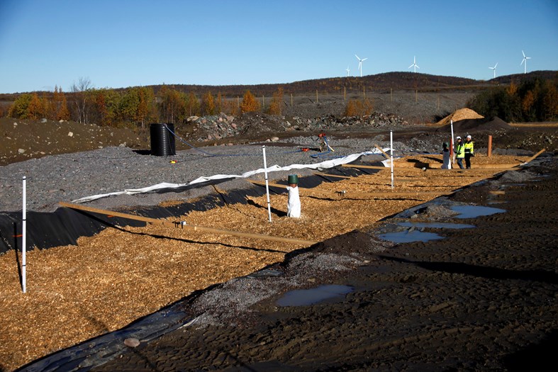 Bioreaktorn är en av lösningarna i projektet NITREM, ett 3-årigt innovationsprojekt som utvecklar en tjänst som kombinerar deponering och efterbehandling, vattenuppsamling och bioreaktorteknologi för minskning av kvävehalten i lakvattnet från sidobergsdeponierna. Bioreaktortekniken har tidigare utvärderats i en pilotskaleanläggning och testas för närvarande i fullskalig drift i Kiruna. Flera parter samarbetar och projektet drivs med EU-medel. Bioreaktortekniken tar bort kväve i form av nitrat från avfallet, en bakteriell rening.– Bioreaktorn är 44 meter lång, 7 meter bred och 2 meter djup. Den består av en stor avlång utgrävning som kan liknas vid en bassäng som vi klär med ett gummimaterial, geomembran, som vulkas ihop för att bli tät. Sedan fylls bassängen med träflis av furu och mellan varje lager om 0,5 meter sprutas ett slam som vi får från reningsverket i Kiruna, säger Ronny Granudd, projektledare på LKAB.