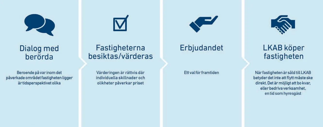 LKAB lämnar sedan ett erbjudande till dig. Beroende på om du äger en villa, hyreshus eller bostadsrätt eller om du är hyresgäst så ser erbjudandet olika ut. För företag, organisationer och myndigheter skiljer sig processen till viss del och kompensationen sker i flera delar. Förhoppningsvis upplevs LKAB:s erbjudande som attraktivt och ger goda möjligheter för framtiden.