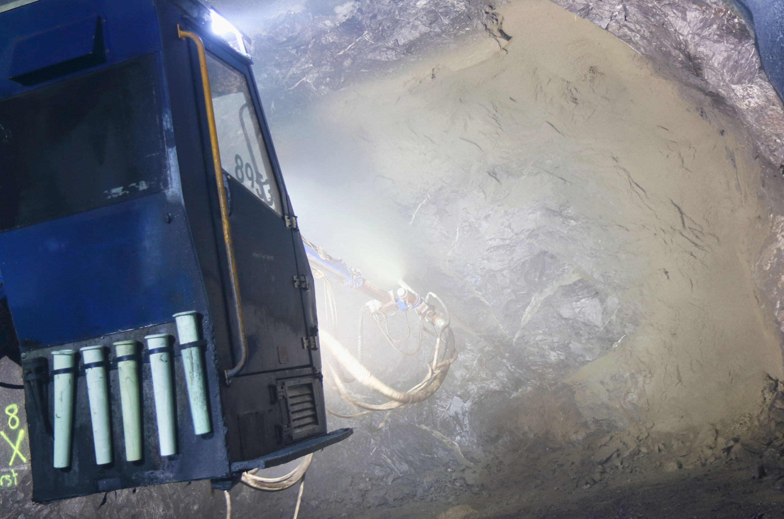 Sprutbetongen finns i stort sett i hela gruvan, i alla verkstads- och kontorsutrymmen, där infrastruktur är placerad och där människor och maskiner arbetar. Det innebär också att det omkring 400 kilometer stora vägnätet som finns under jord, och som hela tiden utökas i takt med produktionen, är betongbesprutad. Men sprutbetongen är bara en del i förstärkningspusslet som utgör den dynamiska bergförstärkningen. Tillsammans med bergbultar och förstärkningsnät – och i vissa fall vajer, blir bergförstärkningen komplett. – Vi betongsprutar ungefär 1 000 kubik per vecka i gruvan. Det är en del av produktionen och så vi bygger gruvan, säger Joel Wahlberg.