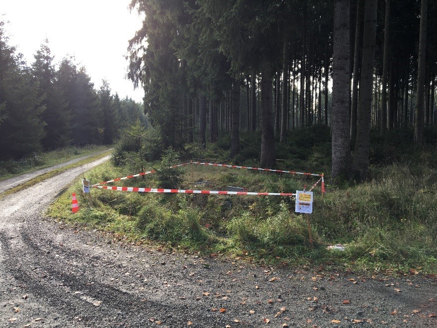 Under mätningarna används både installationer på markytan och helikopterburna instrument. Vi ber er att respektera varningsanordningar och att inte vidröra några kablar eller mätstationer. Strömförande kablar är markerade med varningsskyltar och röd-vita band, enligt bild nedan. Mätstationerna består normalt av en aluminiumbox och olika sensorer inom en radie av cirka 30 meter från boxen. Under mätningarna kommer personal att röra sig i terrängen för att övervaka alla anordningar.