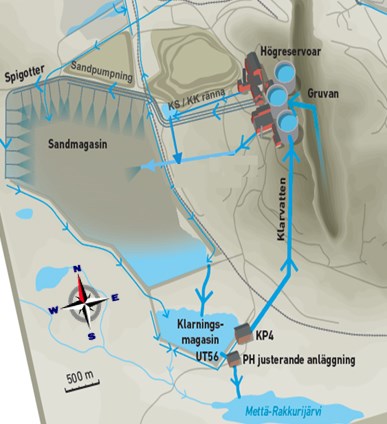I mitten av 1970-talet anlades två dammkonstruktioner väster om Kiirunavaara, ett sand- och ett klarningsmagasin. Vattnet som pumpas upp från gruvan och processvattnet från verken passerar genom magasinen, klarnas och återförs till verken för att där användas på nytt. Miljötillstånd och tydliga regelverk styr nivåer och eventuella utsläpp till intilliggande vattendrag.