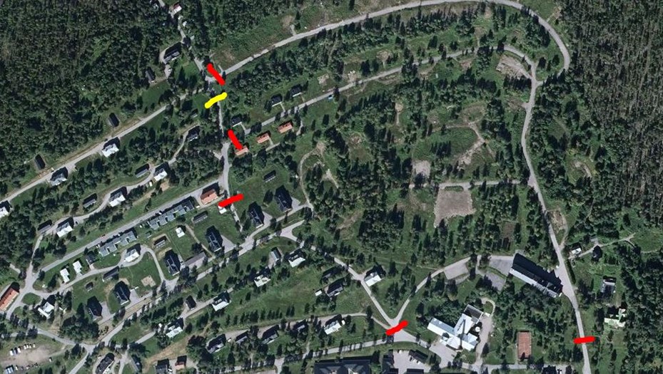 Rött streck visar befintliga grindar, kommer att skyltas. Gult streck visar extra avspärrning (strax före samhällsomvandlingens avspärrning.)