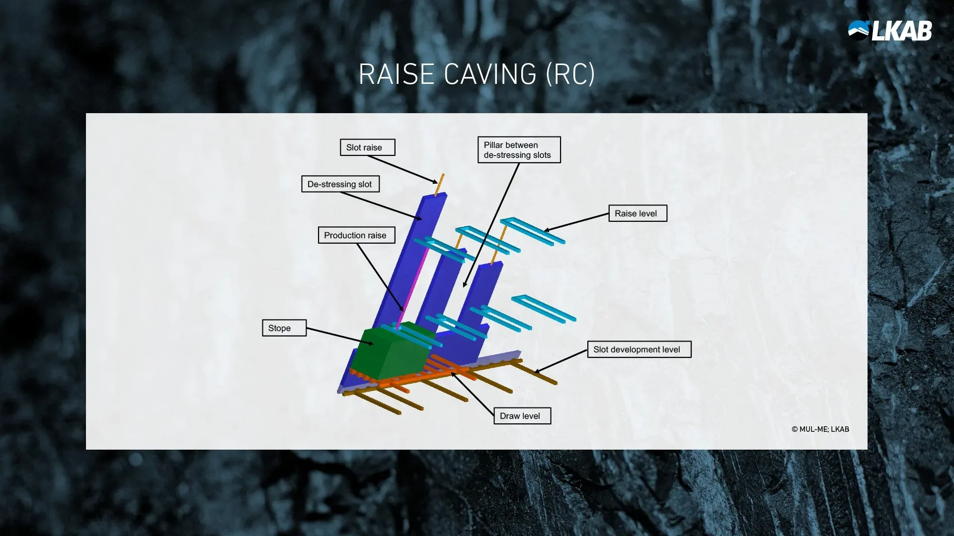 Raise caving, till skillnad från skivrasbrytning, är en metod som gör det möjligt att bryta malmen nerifrån och upp istället för uppifrån och ner. Brytningssekvensen kastas alltså om och det teknikskiftet innebär flera vinster, inte minst i fråga om säkerheten.