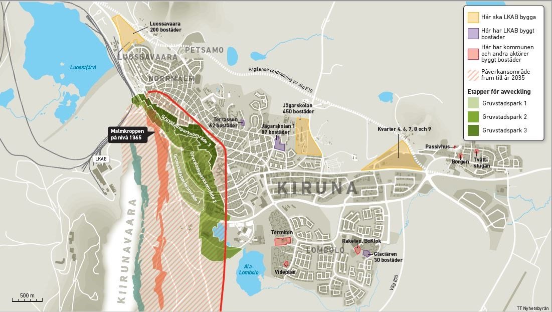 I dag påverkar LKAB:s gruvbrytning ungefär en tredjedel av Kirunas stadskärna. Större delen av centrum, Bolagsområdet, järnvägsområdet samt delar av stadsdelarna Östermalm och Norrmalm påverkas. Kyrkan, simhallen och Folkets Hus är några av byggnaderna som ligger inom det område som berörs av gruvbrytningen på dagens djup. Det finns inte någon exakt skiljelinje var gruvans påverkan på markytan avtar i och med att tidplanerna är baserade på prognoser. – Vi vet att det handlar om minst 3 000 bostäder, 6 000 boende som måste flytta och 450 000 kvadratmeter bostads- och lokalyta som måste byggas upp på nytt, därmed förändras inte vårt åtagande i samhället och de som berörs blir ersatta enligt beslutade tidplaner, säger Stefan Hämäläinen.