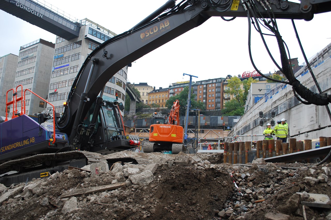 – Det är här Wassarahammaren kommer in i bilden. Hade man borrat ned pålarna som håller uppe allt fundament med tryckluft så hade det funnits en klar risk för sättningar med eventuella sprickor i fastigheter omkring som följd, säger Lars Gellerhed, försäljningsansvarig för LKAB Wassara i Skandinavien och fortsätter: – När luften går ner i hammaren och expanderar rycker det med sig material från hålet. Med vattendriven hammare får man mer precision och mindre material rycks med i processen. Det är en skonsam borrning för både människa och miljö. Skanska ansvarar för att runt 1 700 pålar drivas ner under vattenytan och in i urberget. Det innebär cirka 70 000 meter rör. LKAB Wassara levererar pumpar, adaptrar, backventiler, borrör och borrhammare till projektet. – Vi har hittills skickat tolv stycken hammare och det blir sakta men säkert fler. Själva borrningen utförs av underentreprenörer till Skanska. En del av de tidigare pålarna som monterades ner under vatten när Slussen byggdes på 1930-talet var av trä och därför inte förankrade i berget. – De ligger och flyter i bottensedimentet idag. De nya pålarna ska ner i urberget på ett djup om 70 meter. Borrningen beräknas ta fem år och beskrivs som en stor utmaning med varierande hårdhet i berg och svårigheter om hammaren eller övriga komponenter skulle gå sönder på stora djup.