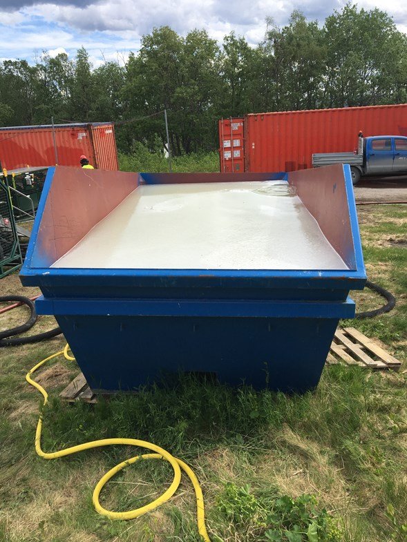 Eftersom vi var nära hålrummet med spräckningarna så misstänkte vi att vi skulle kunna få kontakt med redan öppna sprickor och förlora mycket tryck, vilket i sin tur inte skulle ge den sprickbildning vi önskade. Därför använde vi istället en gel som bestod av guarkärnmjöl och vatten. Guar är en böna som mals till mjöl och används som redning i asiatisk matlagning, men används även som förtjockningsmedel i glass och ketchup. Gelens konsistens är ungefär som tapetklister i färdig form.