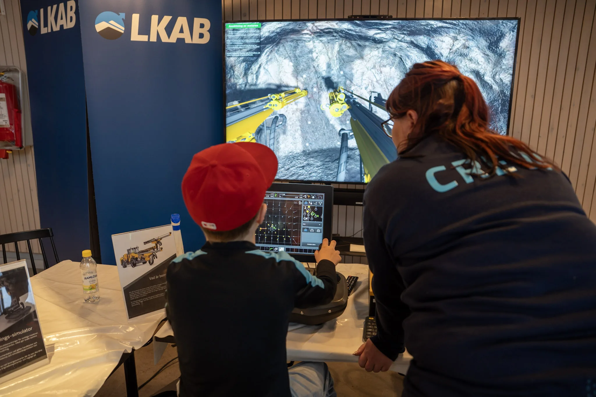 Ville man testa på hur det är att köra borrigg kunde man göra det i utbildningsavdelningens simulator som fanns på plats under dagarna. Julia Tallfjärd och Amanda Alatalo är två av de som jobbade med att instruera i simulatorn.