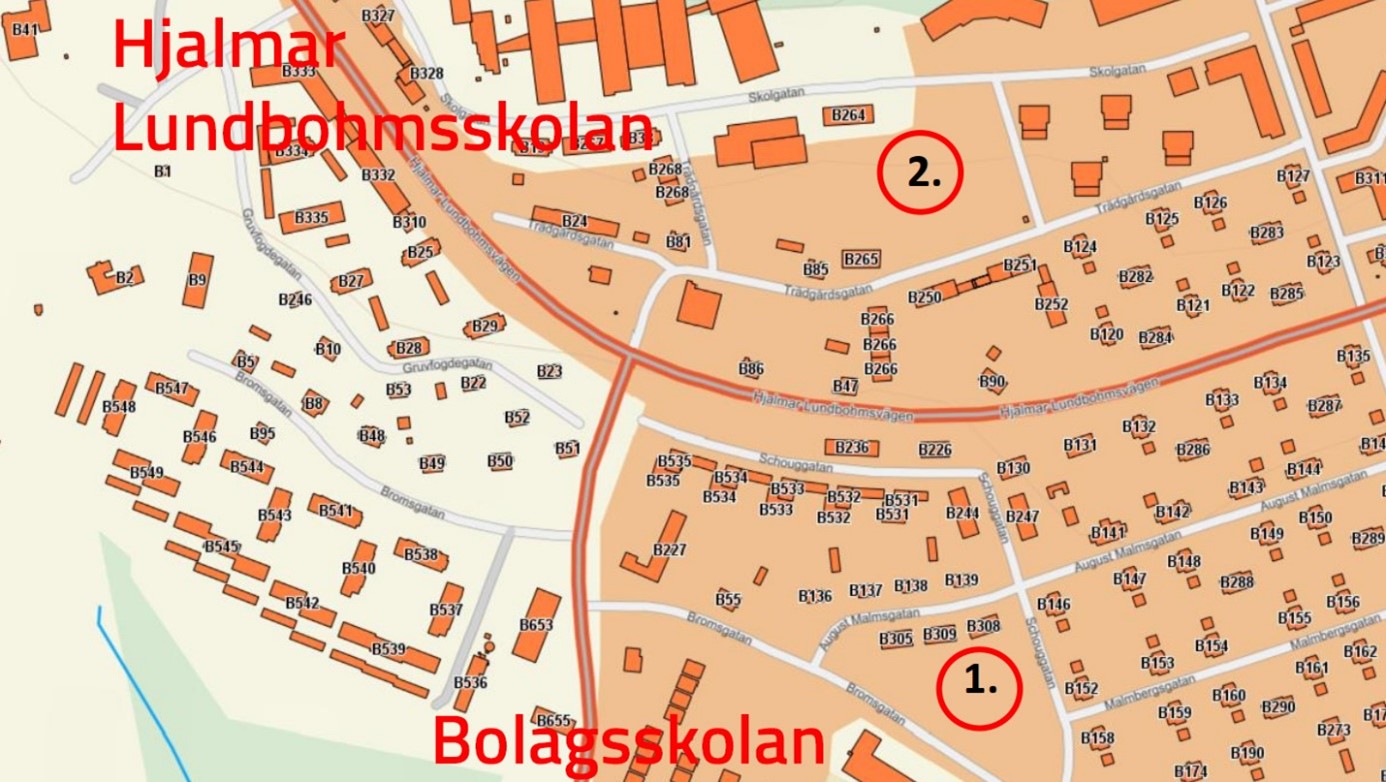 Vi startar i mitten av juli vid Bolagsskolan (punkt 1 på kartan) och fortsätter sedan till området vid Hjalmar Lundbohmsskolan (punkt 2). Borrningarna görs alla dagar kl 06-22 och kommer att pågå under cirka två månader.