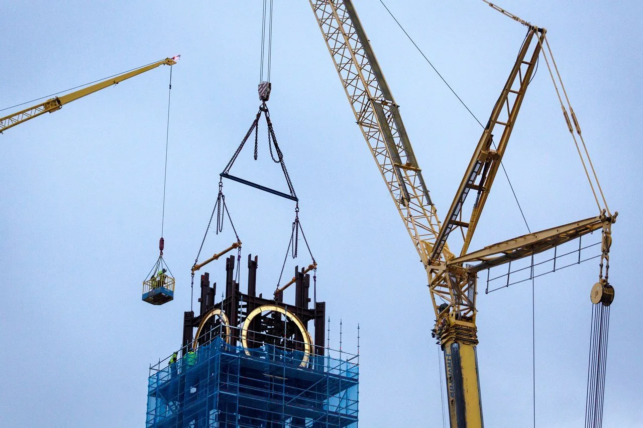 Tidigt den dimmiga morgonen den första augusti lyftes första biten av det 26 meter höga Klocktornet ned från stadshustaket i …