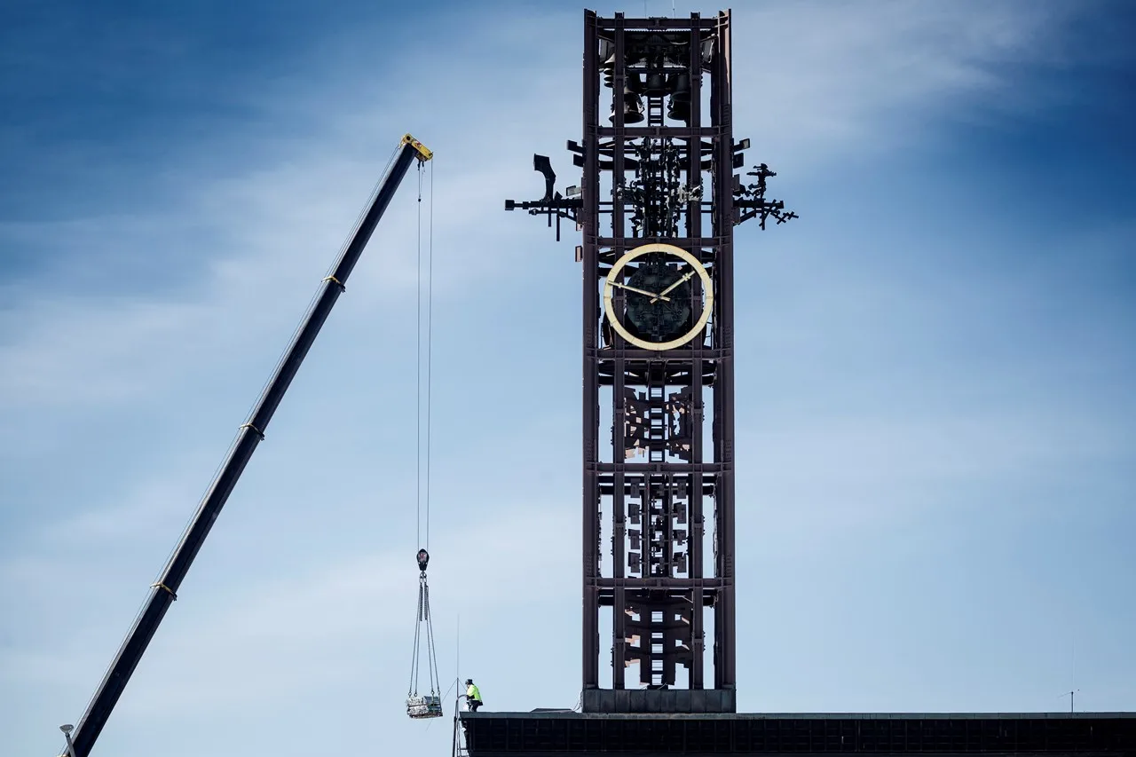 Ställningsmontaget runt Kirunas klocktorn är på plats och konstruktionen är besiktad. Nu ska vissa delar repareras innan sommarens flytt i …